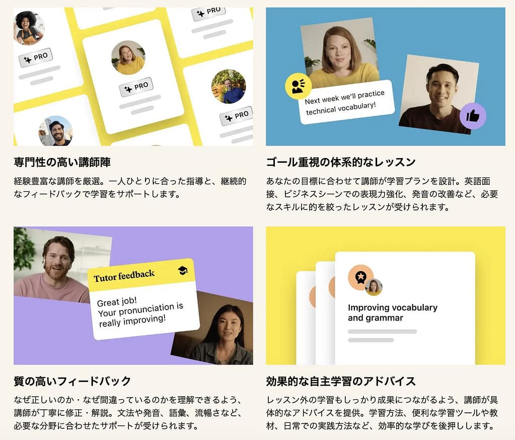 従来のサービスに加えて、「Pro講師のレッスンが受けられる」、「ゴール重視の体系的なレッスン」、「きめ細やかなフィードバック」などのサービスを受けることができます。