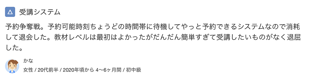 特に、「全体的に教材の難易度が低く初級者におすすめである一方、上級者には物足りない」という印象が強いです。