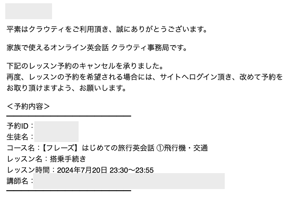 キャンセル後、上図のようなメールが届いたらキャンセル完了です。