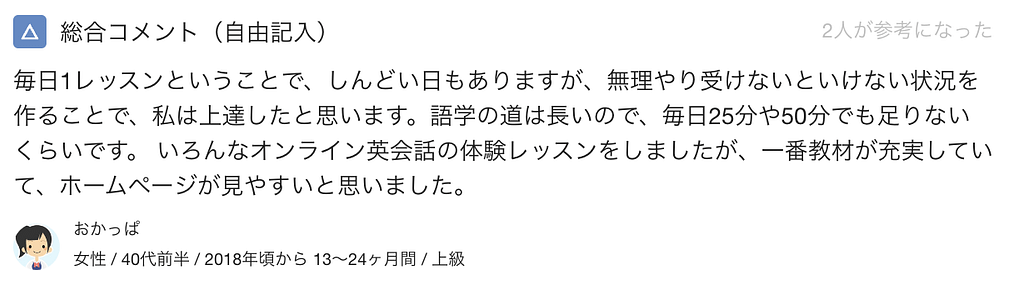 しかし、私は毎日レッスンをすることがむしろ英語の勉強をする上で良いルーティンになっていましたので、しんどいと感じることはありませんでした。