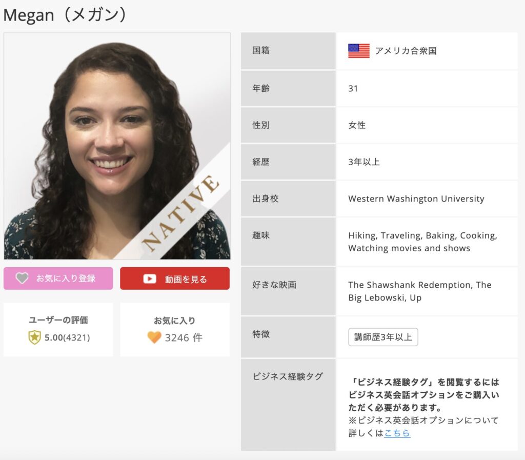 フリーワードで「Japan」と入れて検索したのち、講師プロフィールにてどのような講師かを確認してからレッスンを受けてみましょう。
