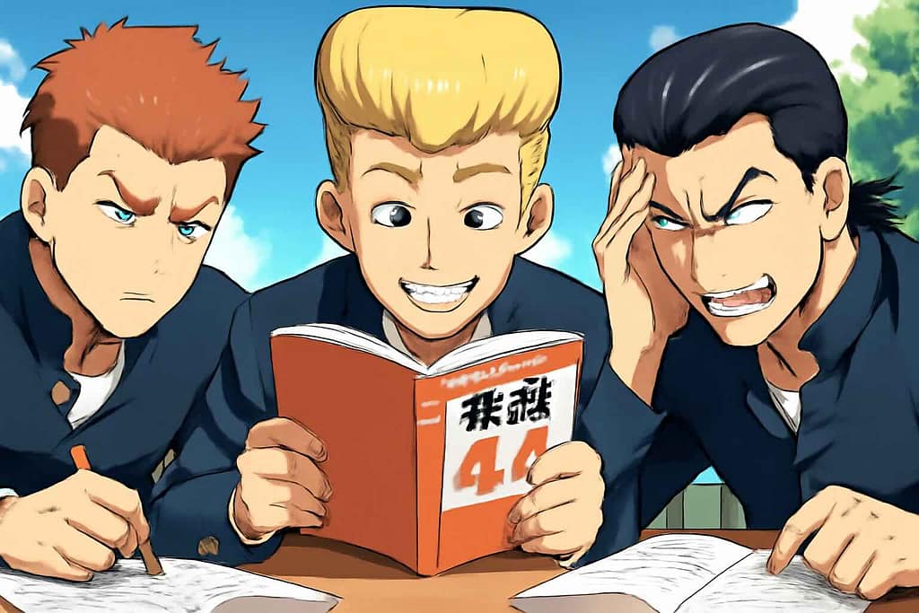 デュオリンゴのレベルと英検を見比べているビジネスマンたち