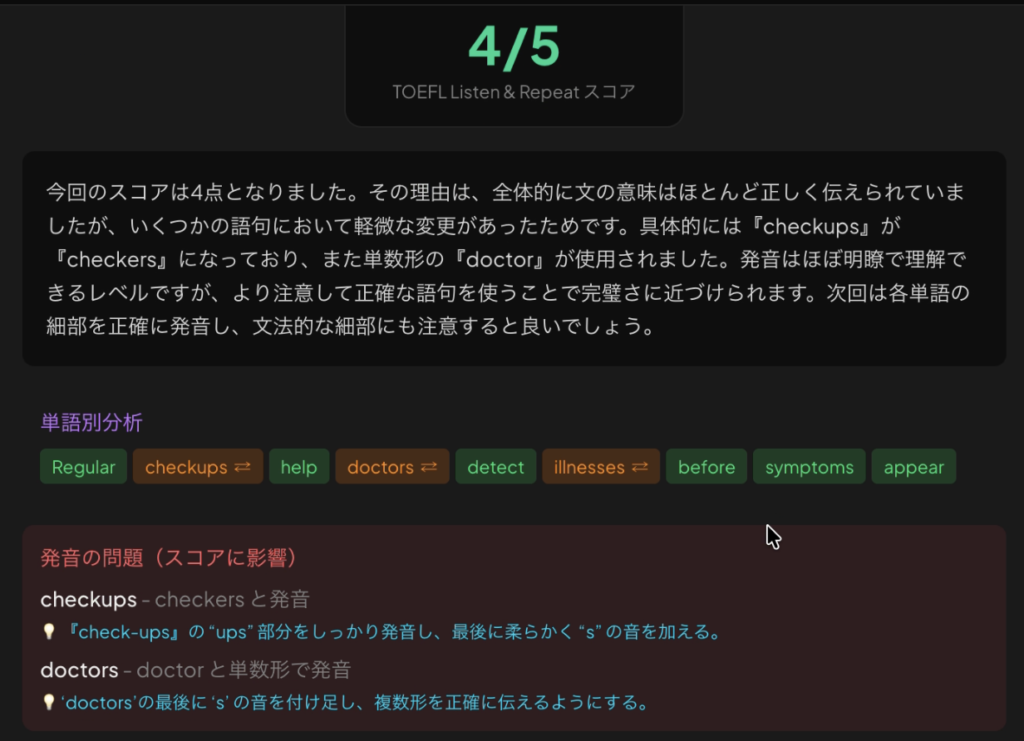 個人的には、同じAIでも、公式アプリとして任用されているSanta TOEFLの方が精度は高いかなと感じました。