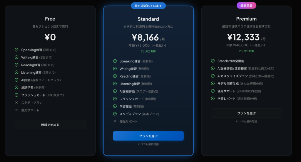 まずは各セクション3回まで試せる「Freeプラン」で、AIによるフィードバックの精度を体感してみるのが良いでしょう。