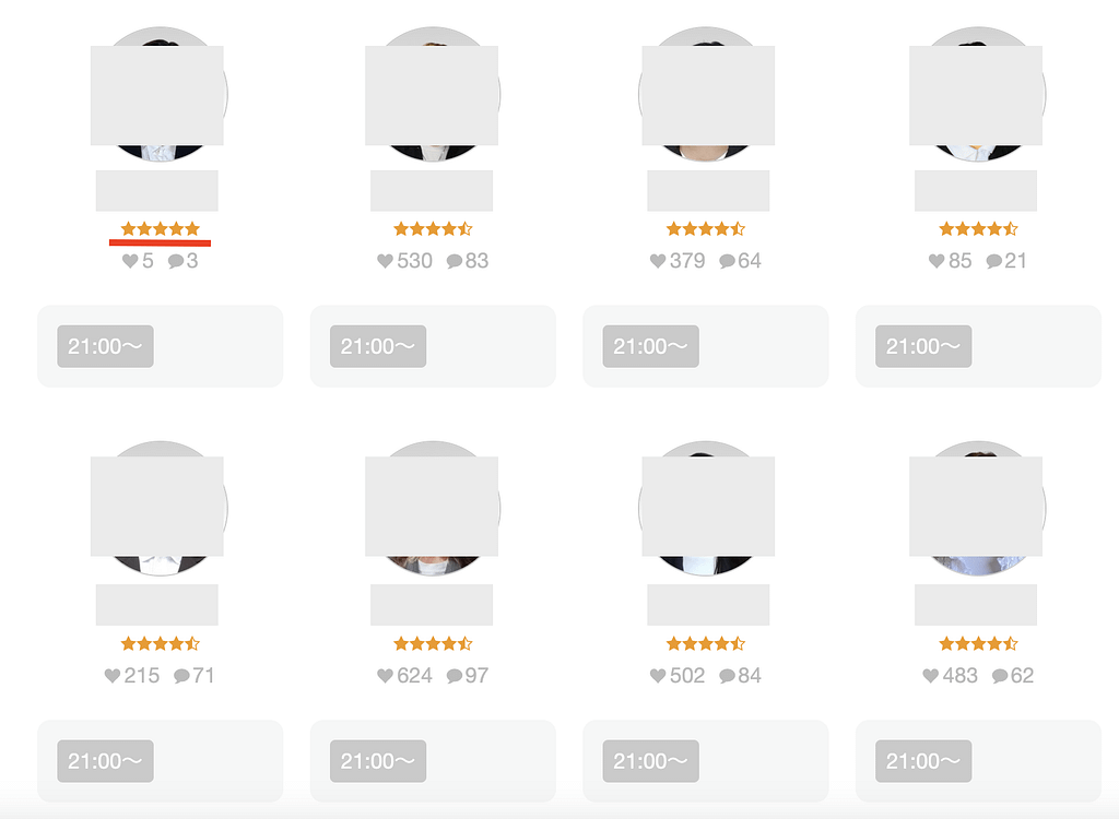 例えば、講師の検索画面やプロフィールには上図のように顔写真の下に星が示されています。