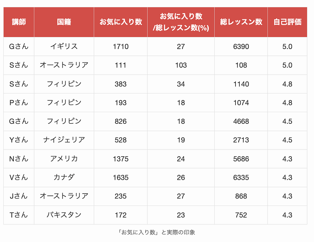 ということで、講師の評価値、予約レッスン数、お気に入り数と私が実際に受講して得た講師の印象を照らし合わせどの基準が一番講師を選ぶのに適しているのか調べてみました。