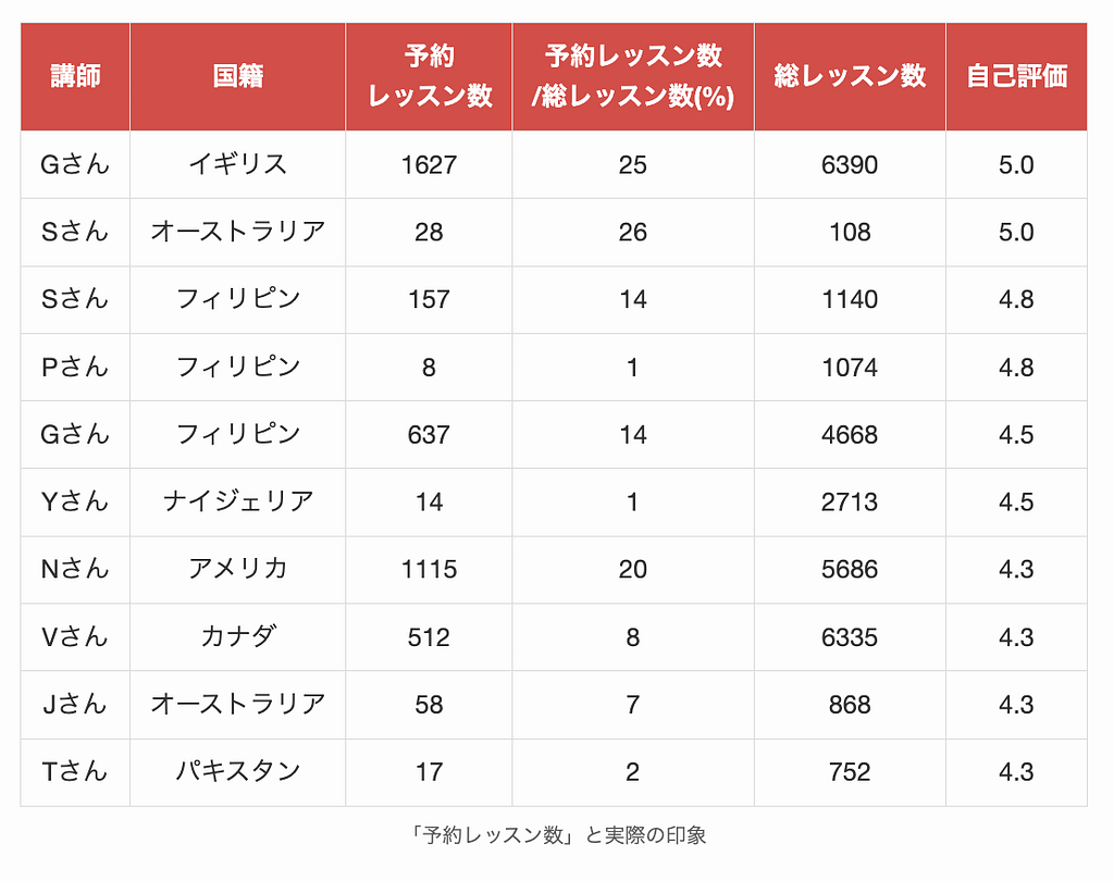 評価が4.98〜5.0の講師たちは、国籍に関わらず全て自己評価が高かったです。