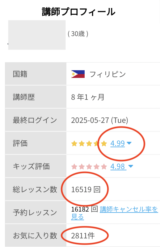 ・国籍は関係なく総レッスン数が100以上で評価が4.98以上の講師は良い講師だったから