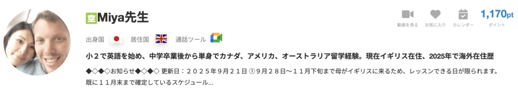 Miya先生は毎日熱心にレッスンを開講してくれていますので、人気講師とはいえ比較的予約が取りやすくておすすめです。
