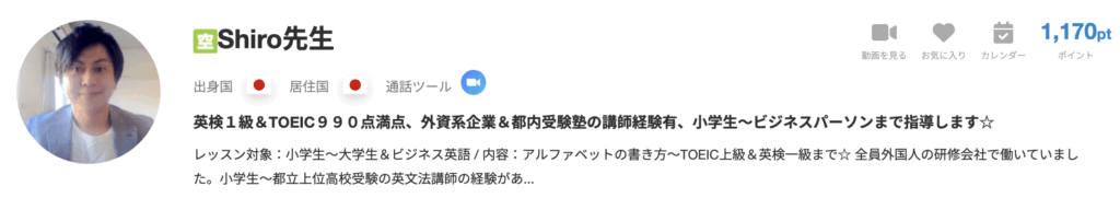英検1級、TOEIC満点、外資系企業や都内受験塾の講師経験を持ち、TOEIC、英検、学生の英語力アップ、シャドーイング、TEDを用いたレッスンなどを開講されています。